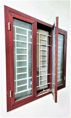Casement and sliding steel windows with wood-grain finish, security grilles, and mosquito mesh options.